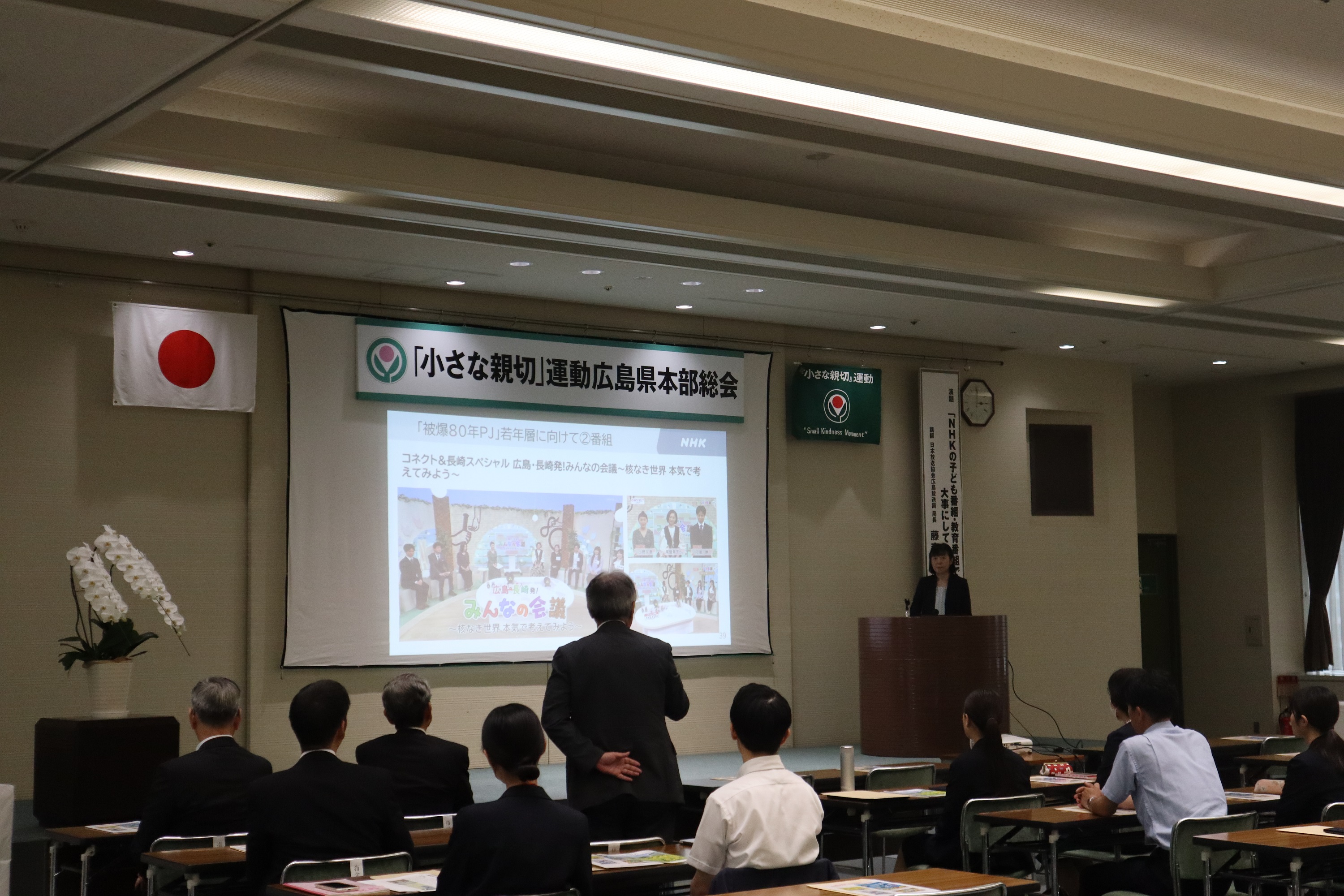 「第47回『小さな親切』運動広島県本部総会」開催 約60名の会員の方にご参集いただき、すべての議案が可決されました。この総会をもって24年間にわたり広島県本部の代表を務めてきた森本代表が退任し、新たにもみじ銀行の小田会長が第3代代表に就任しました。 総会の後には、NHK 広島放送局の藤森局長による記念講演を開催しました。 演題:「NHKの子ども番組・ |